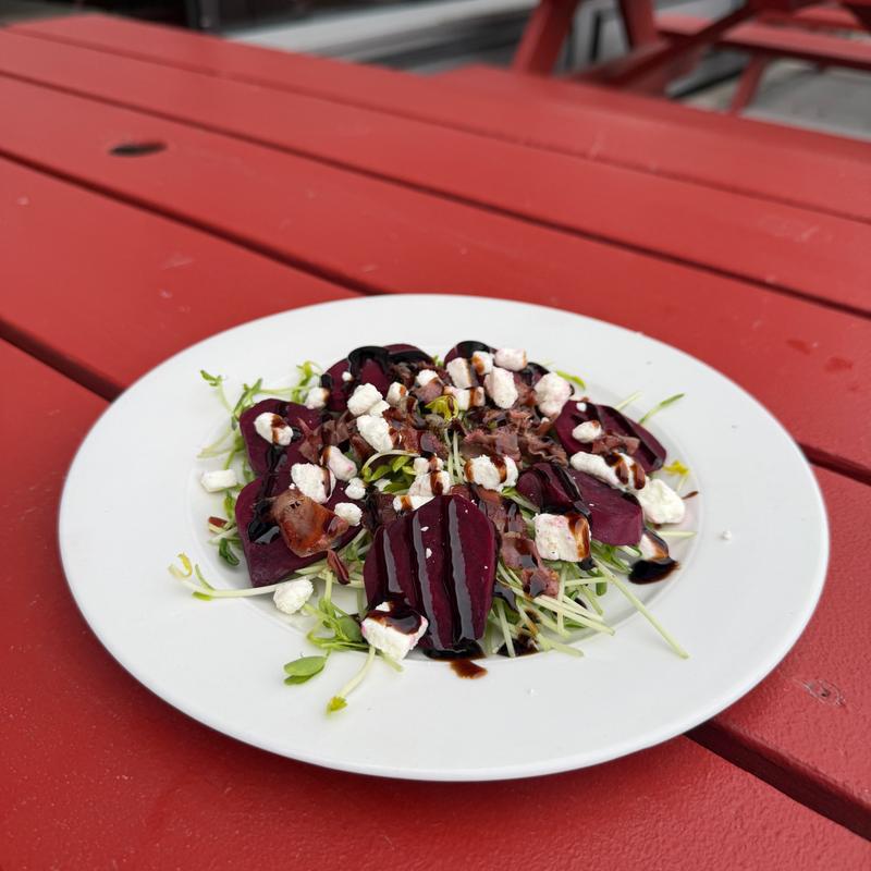 Pea Microgreens, Beets, Goat Cheese, Prosciutto